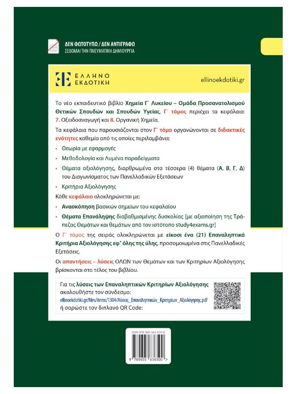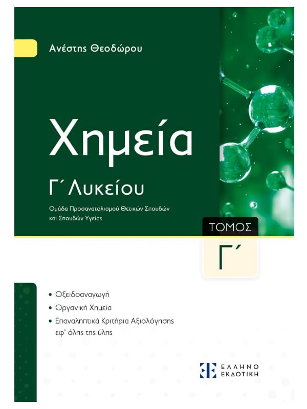 Το νέο εκπαιδευτικό βιβλίο Χημεία Γ΄ Λυκείου – Ομάδα Προσανατολισμού Θετικών Σπουδών και Σπουδών Υγείας, Γ΄ τόμος περιέχει τα κεφάλαια: 7. Οξειδοαναγωγή και 8. Οργανική Χημεία.
