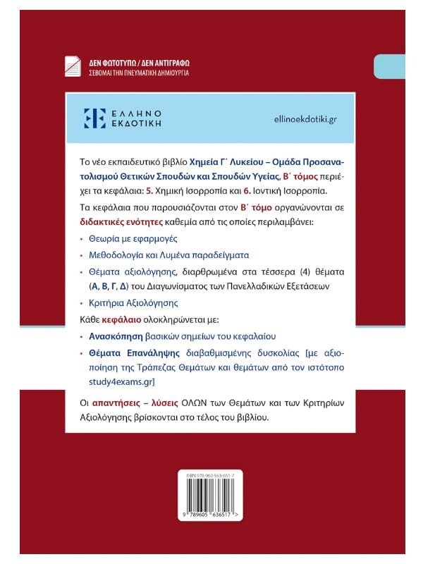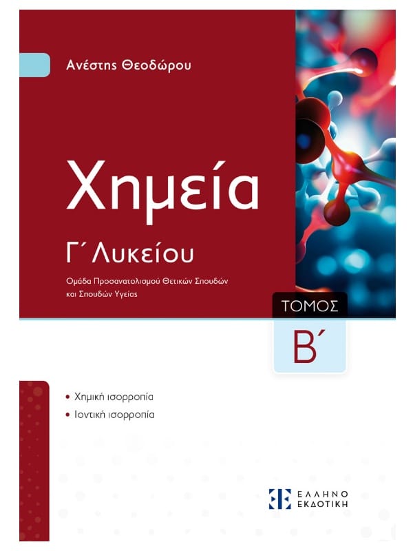 Το νέο εκπαιδευτικό βιβλίο Χημεία Γ΄ Λυκείου – Ομάδα Προσανατολισμού Θετικών Σπουδών και Σπουδών Υγείας, Β΄ τόμος περιέχει τα κεφάλαια: 5. Χημική ισορροπία και 6. Ιοντική ισορροπία.